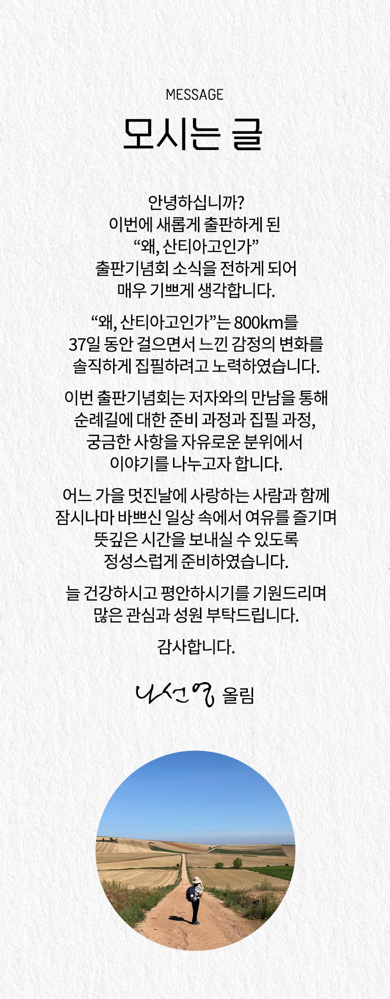안녕하세요. 오늘은 출판기념회와 북콘서트를 위한 모바일초대장 제작 사례를 소개해 드립니다. 왜 산티아고인가 출판을 기념하는 행사 초대장을 모바일에 최적화된 형태로 기획·제작하였습니다.