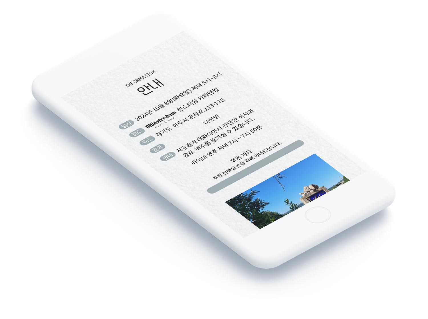 - 행사 초대 메시지, 일정, 장소 안내 등을 모바일 화면에 맞춰 간결하게 정리했습니다.