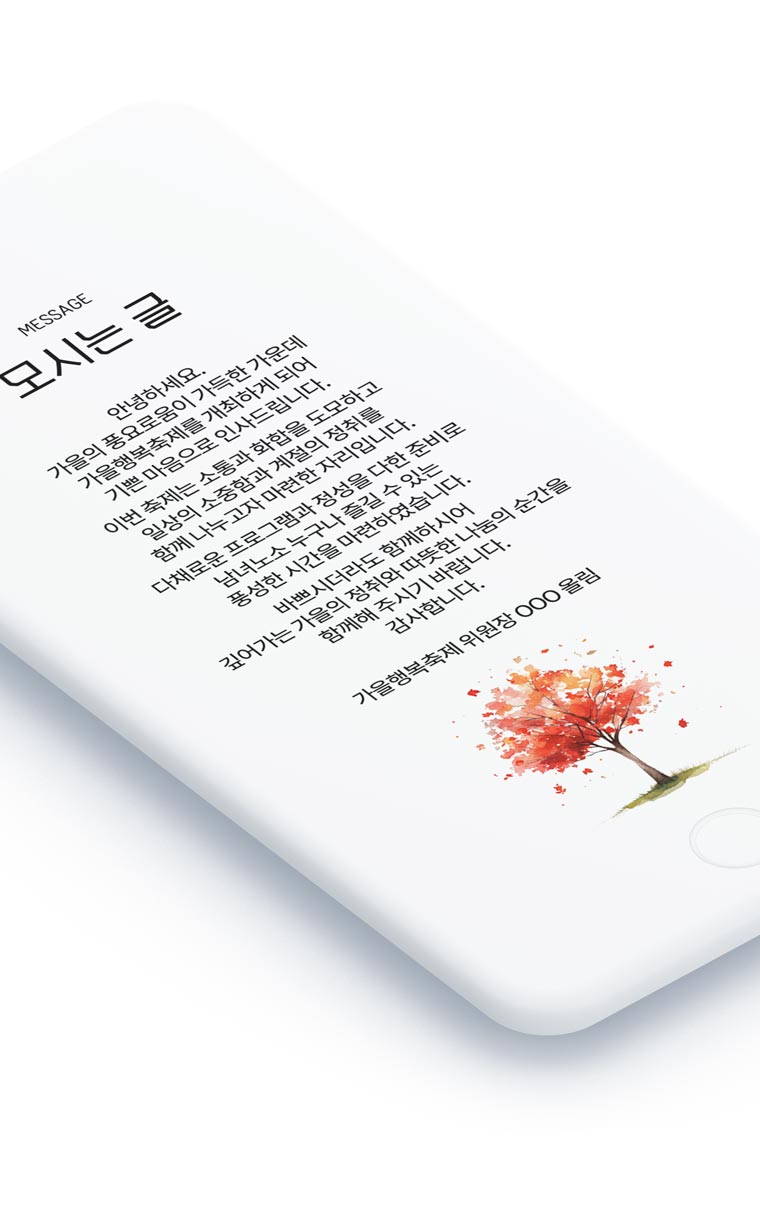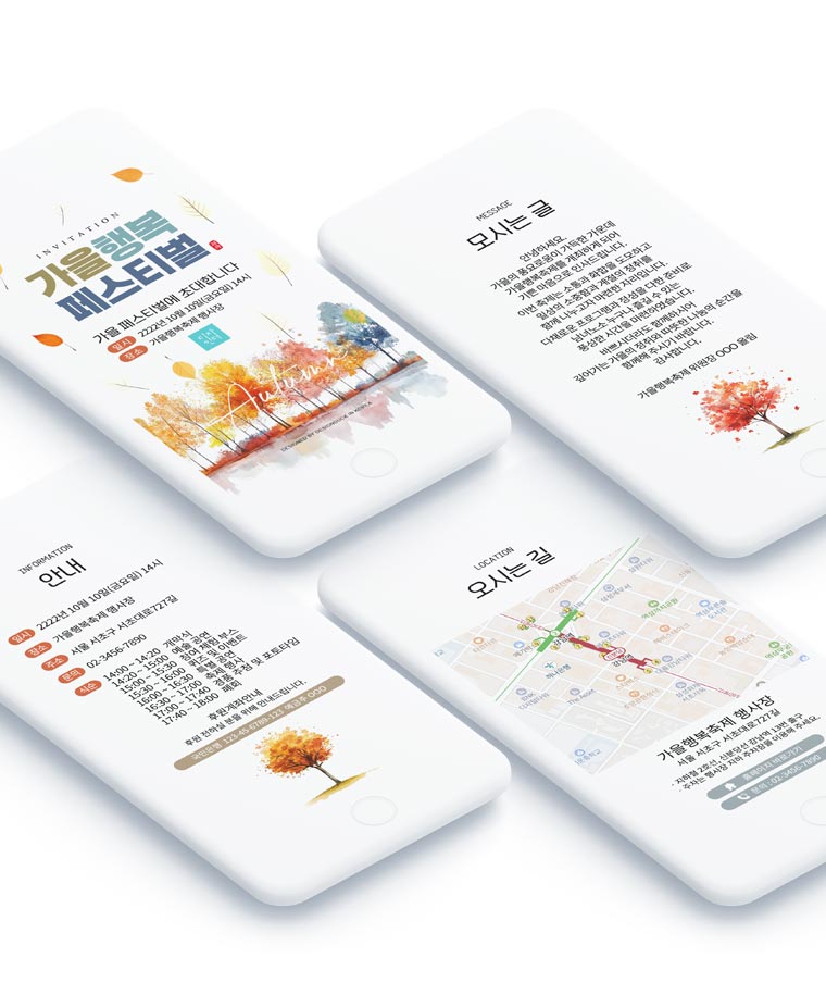가을의 정취가 물씬 느껴지는 계절, 각종 축제와 행사가 풍성하게 펼쳐지는 시기입니다. 단풍이 물드는 아름다운 가을 풍경을 배경으로 한 축제 행사 준비를 위해 눈길을 사로잡는 모바일 초대장이 필수입니다.