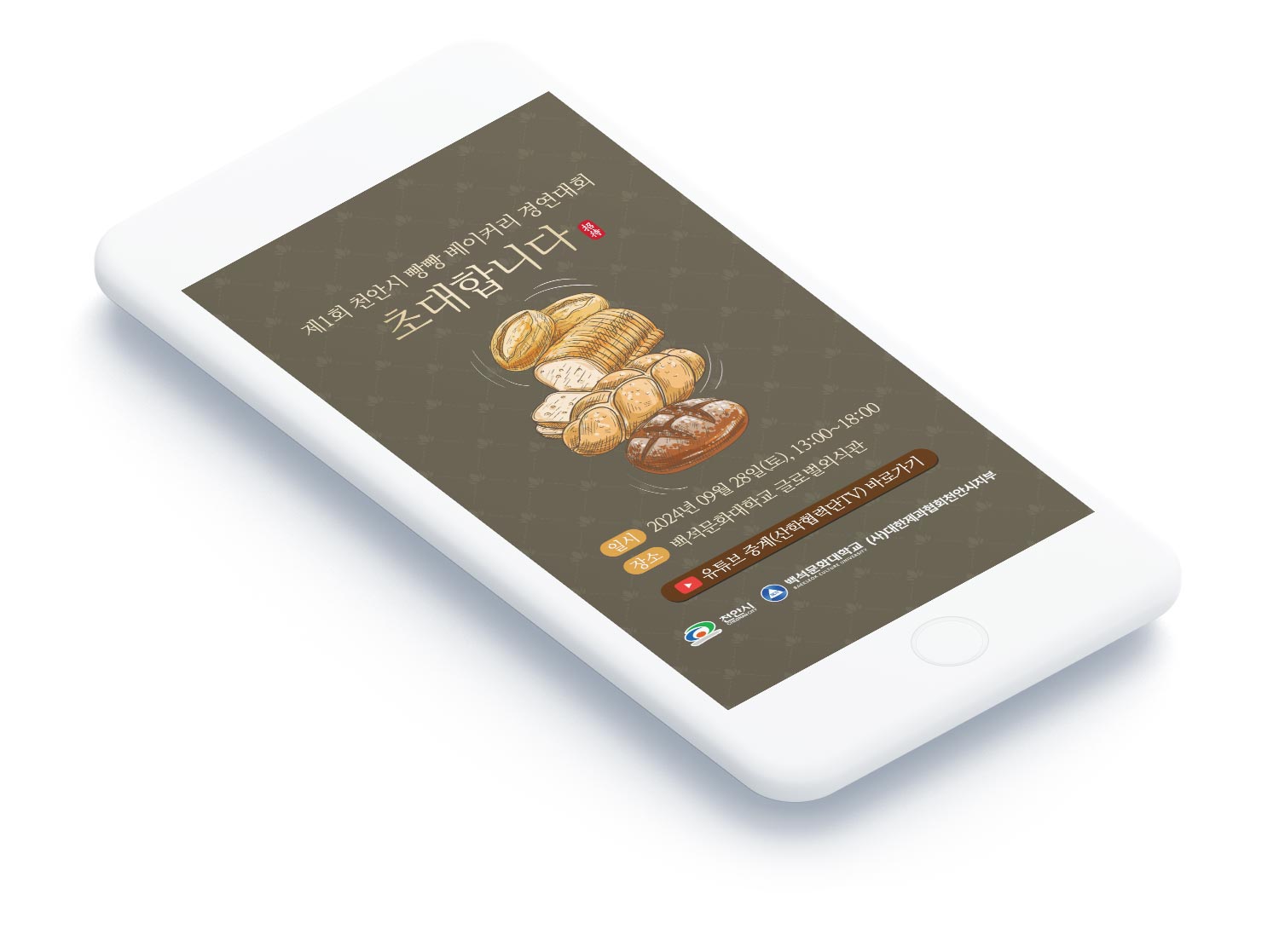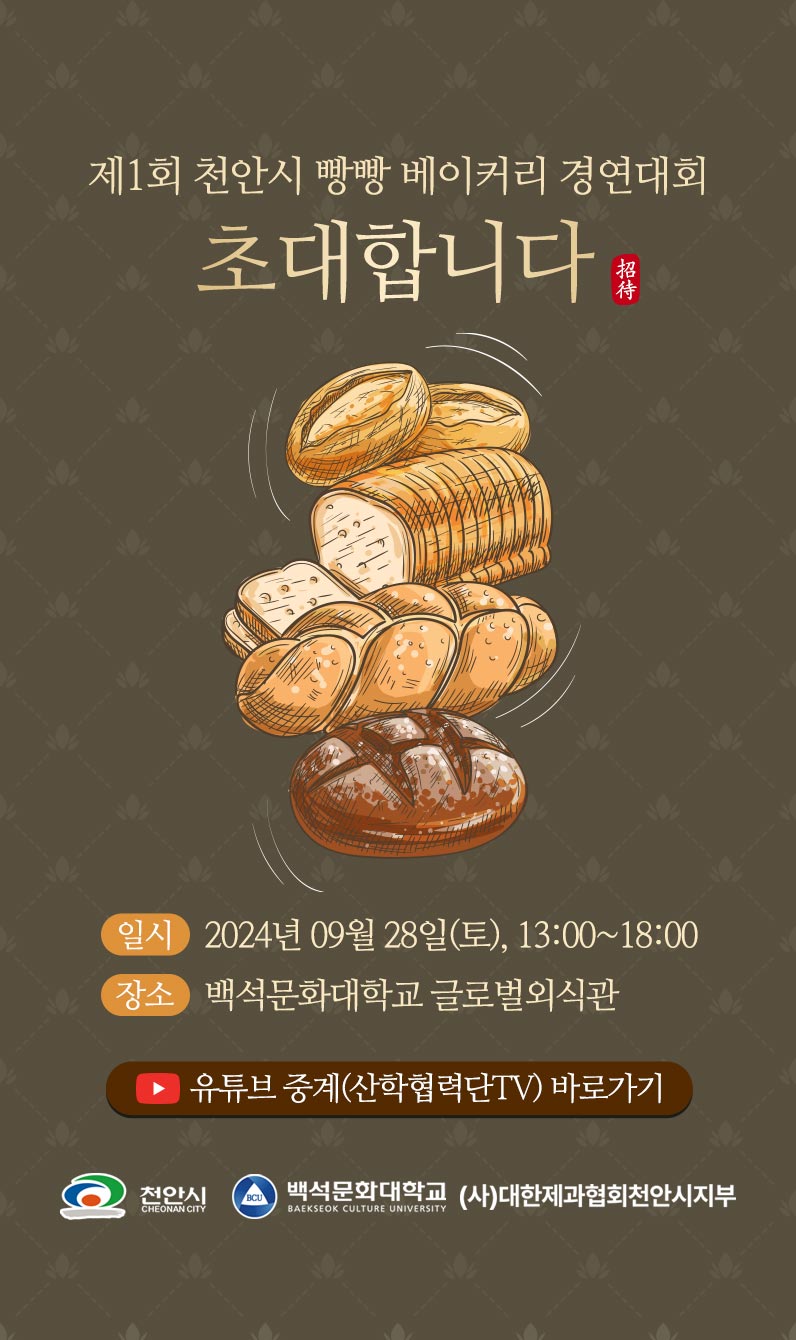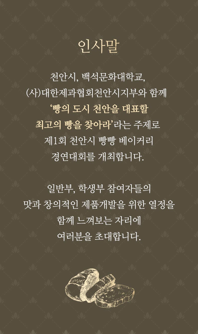 안녕하세요! 오늘은 천안시에서 개최되는 특별한 베이커리 경연대회를 위해 제작된 모바일 초대장 사례를 소개해드리려고 합니다. 지역 특산물과 전통을 살린 베이커리 대회라는 특성을 고려하여, 따뜻하고 친근한 느낌의 디자인으로 완성된 초대장입니다.