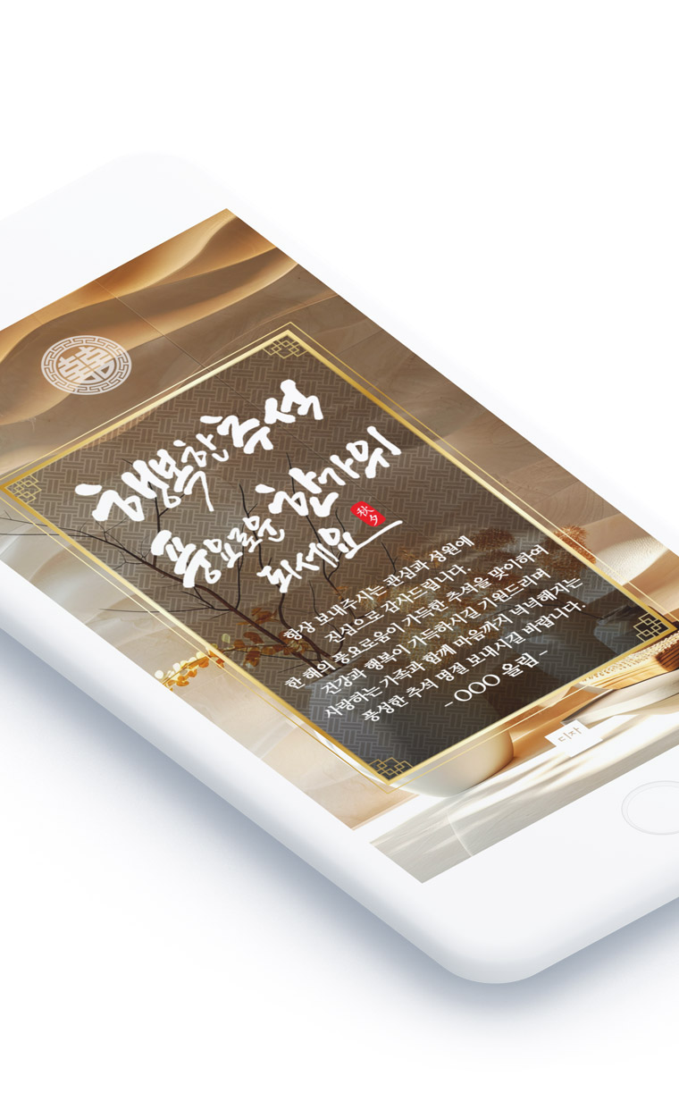 올해 추석에는 전통의 아름다움이 담긴 특별한 디자인으로 소중한 분들께 감사와 사랑의 마음을 전해보세요. 6가지 다양한 테마 중에서 상황에 맞는 디자인을 선택하여 더욱 의미 있고 기억에 남는 명절 인사를 만들어 가시길 바랍니다.