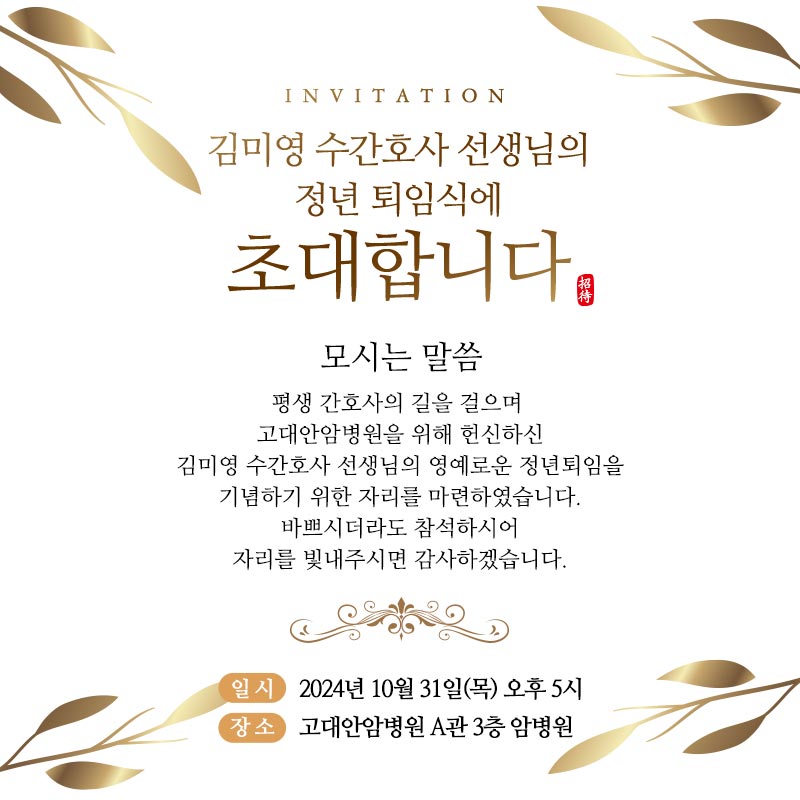 오랜 시간 헌신하신 수간호사님의 정년퇴임식을 위해 제작한 모바일초대장 사례를 소개해드립니다.
