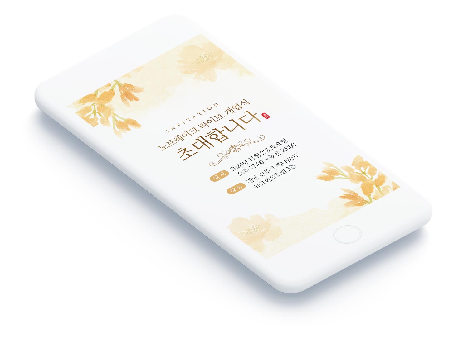 부드러운 수채화 기법의 옐로우 꽃 일러스트가 초대장 전체를 감싸고 있습니다.