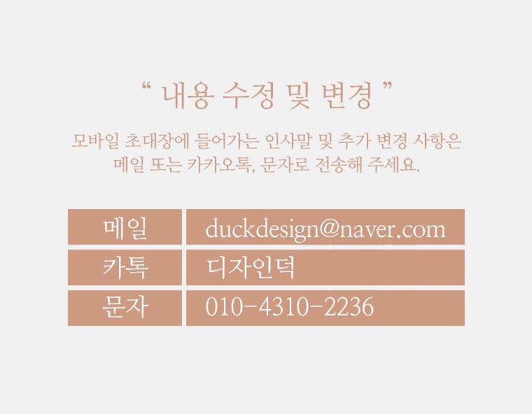모바일초대장의 가장 큰 장점은 유연한 커스터마이징입니다. 기본 구성인 메인-인사말-안내-오시는길에 갤러리를 추가할 수도 있고, 필요에 따라 섹션을 변경하거나 추가할 수 있습니다.