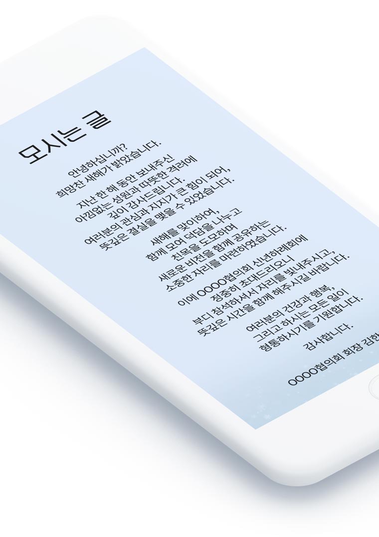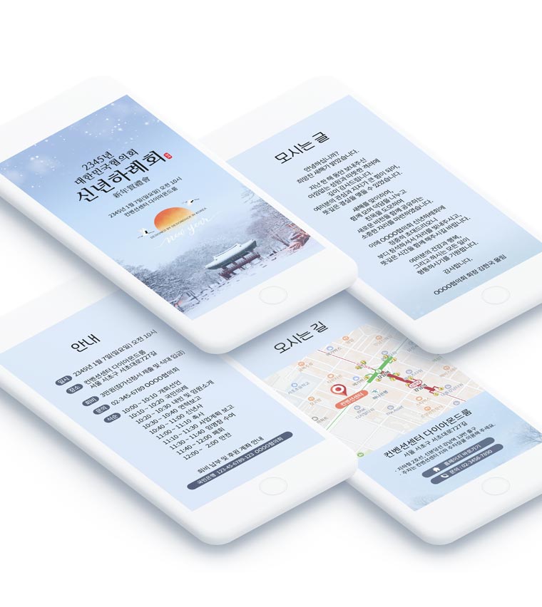 특별한 모바일초대장을 통해 소중한 분들을 정중히 모시고, 행사의 첫인상부터 프로페셔널한 이미지를 심어드립니다. 귀사의 신년행사가 더 큰 성공과 발전을 이루는 값진 시간이 되길 바랍니다.