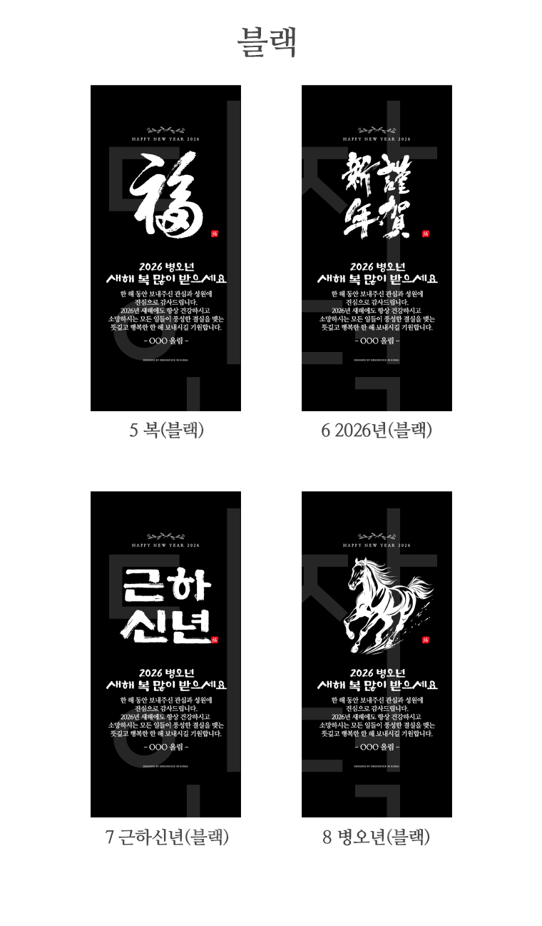 블랙 배경 디자인은 강렬하고 모던한 인상을 줍니다. 흰색 서예체가 검은 배경 위에서 더욱 돋보이며, 세련되고 현대적인 감각을 표현합니다.