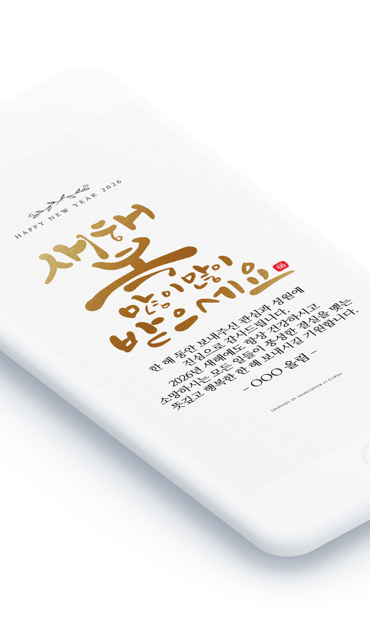 "새해 복 많이많이 받으세요"라는 정겨운 인사말이 손글씨 느낌의 캘리그래피로 표현되어 있습니다. 디지털 연하장이지만 손으로 직접 쓴 듯한 따뜻함이 느껴져, 받는 이에게 더욱 진심이 전달됩니다.