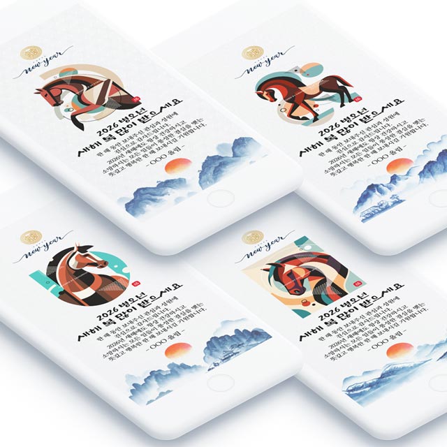 2026년은 병오년, 말의 해입니다. 전통적인 한국의 정서가 담긴 새해배경과 현대적인 디자인이 조화를 이룬 4가지 신년카드 디자인을 준비했습니다. 각 디자인마다 수묵화 느낌의 산과 일출이 어우러진 배경에 역동적인 말의 모습이 담겨있어, 새해의 희망찬 기운을 전달하기에 완벽합니다.