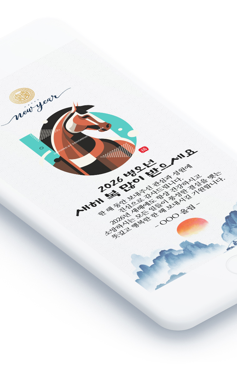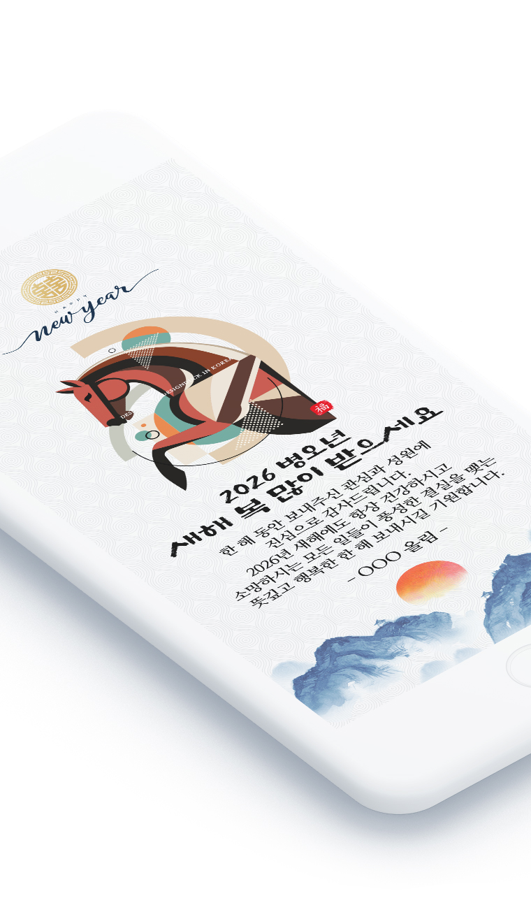 2026년 병오년, 모바일 새해카드로 소중한 분들께 마음을 전하세요. 전통과 현대가 어우러진 세련된 디자인과 진심 어린 메시지로 새해의 첫 인사를 특별하게 만들어드립니다.
