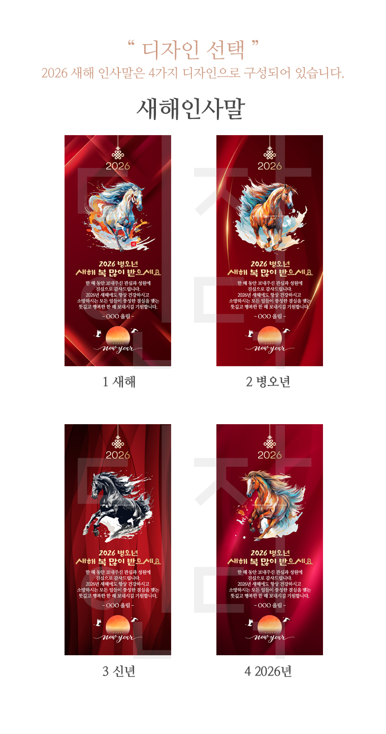 2026년은 병오년으로, 붉은 말의 기운이 가득한 해입니다. 이번 신년카드는 역동적인 말의 이미지와 함께 4가지 컨셉의 디자인으로 준비되었습니다. 각 디자인마다 붉은 배경과 금색 장식으로 새해의 화려함과 전통미를 담았습니다. 2026이라는 숫자와 함께 새해 분위기를 물씬 느낄 수 있는 구성입니다.