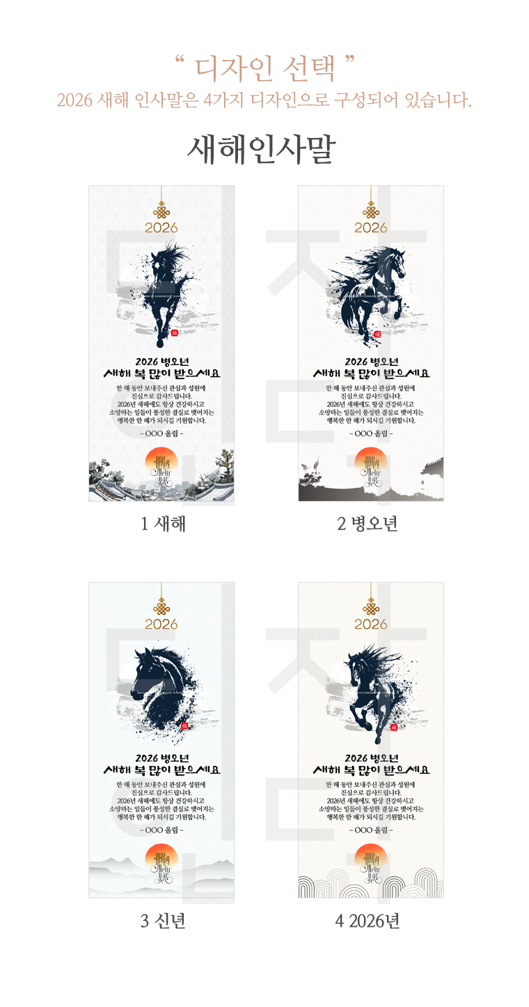 2026년은 병오년으로 붉은 말의 해입니다. 말은 예로부터 역동성과 전진, 성공을 상징하는 동물로 여겨져 왔습니다. 이번 새해인사말 디자인에는 힘차게 달리는 말의 모습을 수묵화 스타일로 담아 전통미와 현대적 감각을 동시에 표현했습니다.