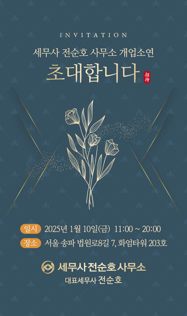 세무사 개업은 새로운 시작이자 중요한 첫인상을 남기는 순간입니다. 새로운 출발을 알리는 이번 개업소연 초대장은 전문성과 품격을 동시에 담아냈습니다.