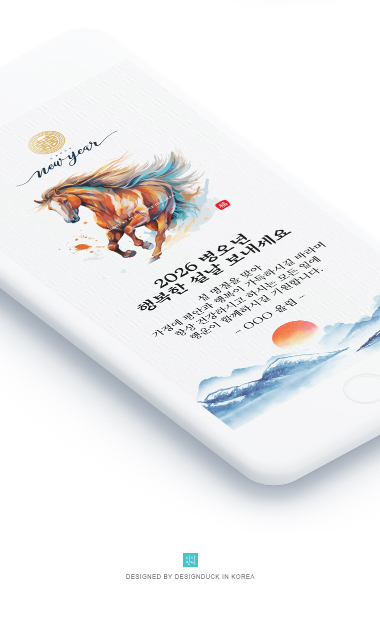 2026년 병오년의 상징인 말을 수채화 기법으로 힘차게 표현한 특별한 디자인입니다. 역동적인 말의 모습과 푸른 산수화 배경이 어우러져 새해의 활기찬 기운을 전달합니다. 병오년을 강조하고 싶을 때 추천합니다.