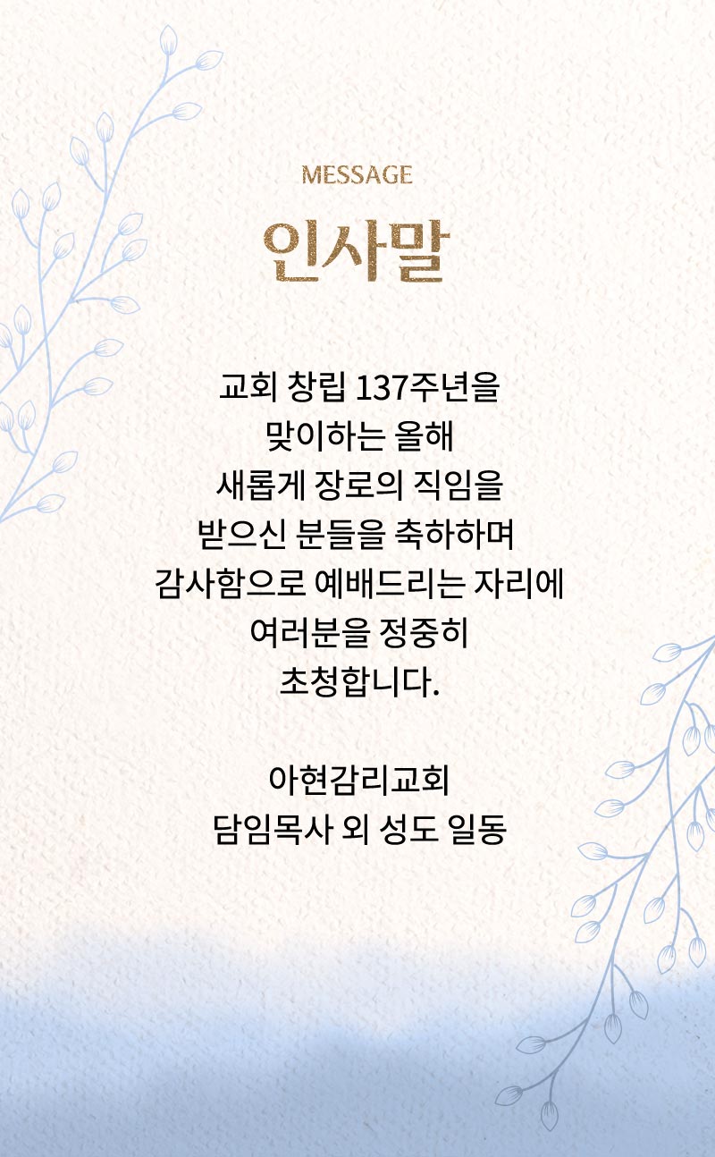 임직식·취임식 초대장은 예배의 품격을 먼저 전달하는 역할을 합니다. 종이 초대장이 갖는 정성도 귀하지만, 오늘날 교인들과의 소통은 대부분 카카오톡과 문자로 이루어집니다.