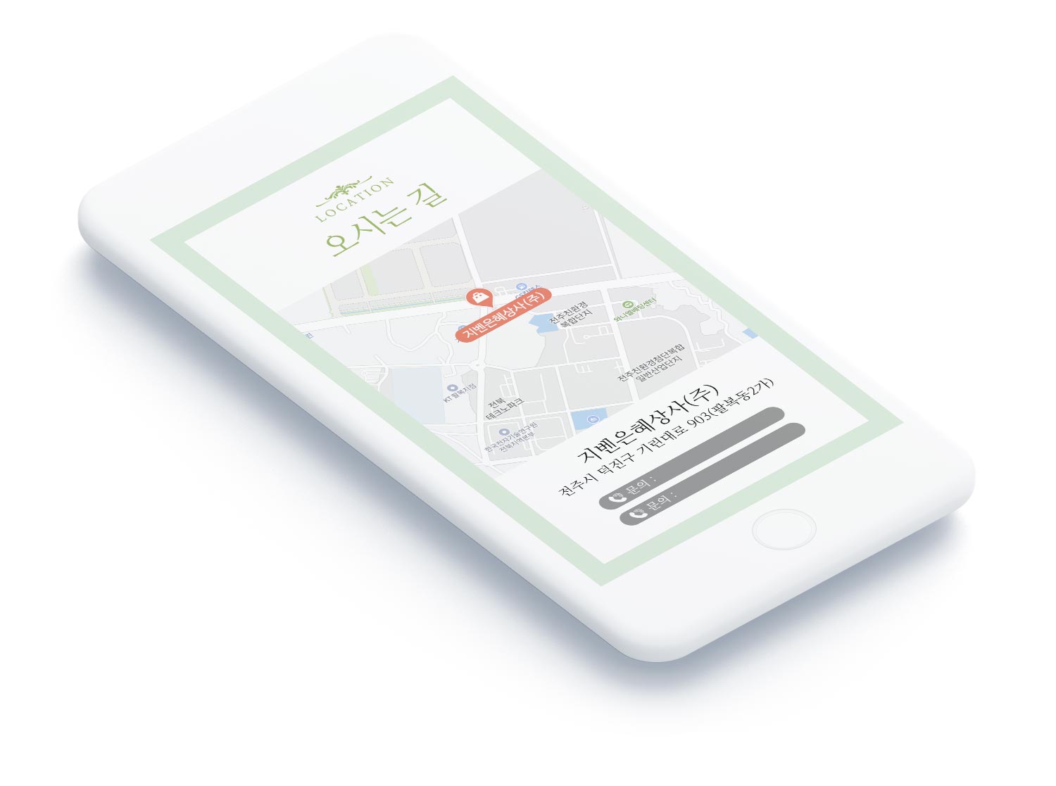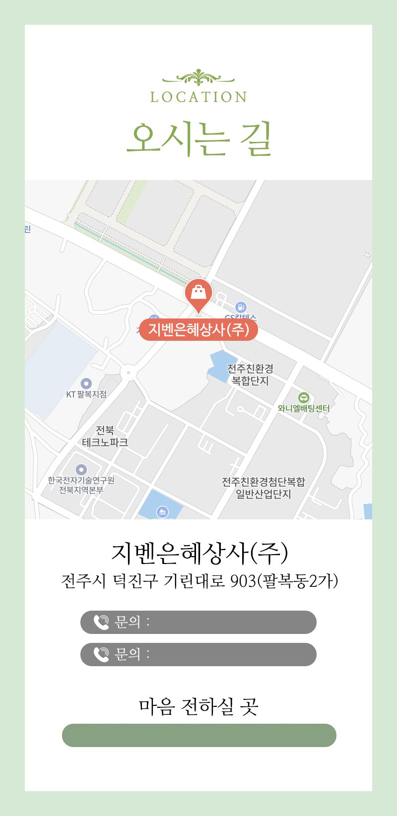 초대장은 모바일 세로 스크롤에 최적화된 구조로 제작되었습니다. 상단에서 일시와 장소를 직관적으로 확인할 수 있고, MESSAGE 섹션에서는 대표자의 인사말을 통해 행사의 의미와 감사의 마음을 전달합니다. INFORMATION 섹션에서는 행사 정보와 담당자 연락처를 명확하게 정리했고, 마지막 '오시는 길' 섹션에는 지도 이미지와 함께 주소, 주차 안내, 계좌번호까지 한 화면에서 확인할 수 있도록 구성했습니다.