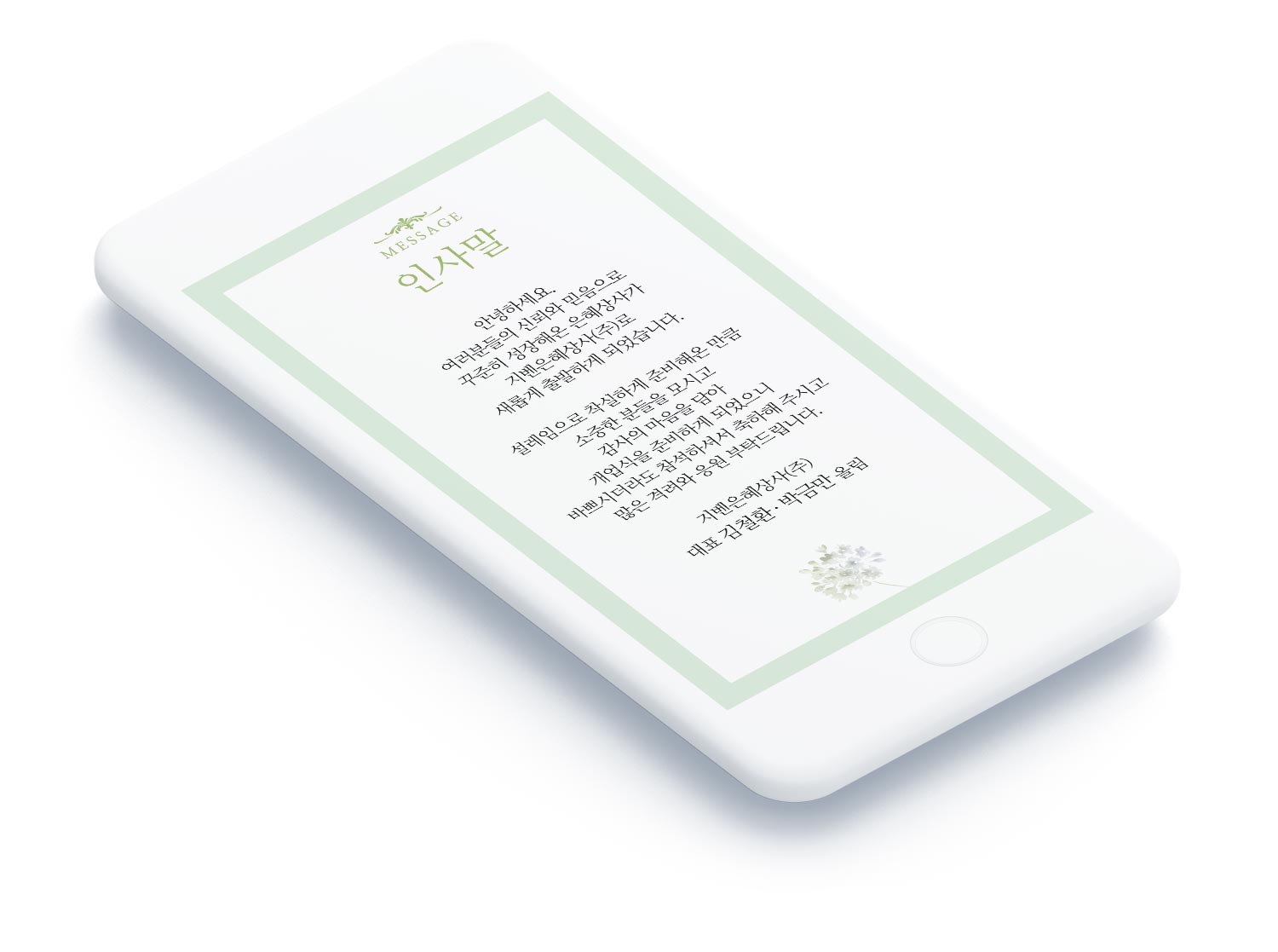배경은 화이트 베이스에 연한 민트·그린 톤을 포인트로 사용해 청결하고 신뢰감 있는 이미지를 구현했습니다. 이는 법무·세무·의료·뷰티 등 전문직 사업장 개업은 물론, 쇼핑몰·카페·음식점 오픈 행사에도 자연스럽게 어울리는 범용성 높은 디자인입니다.