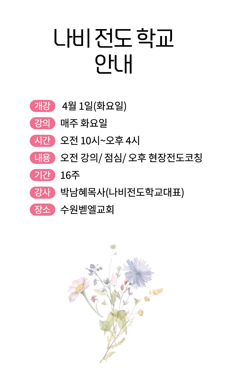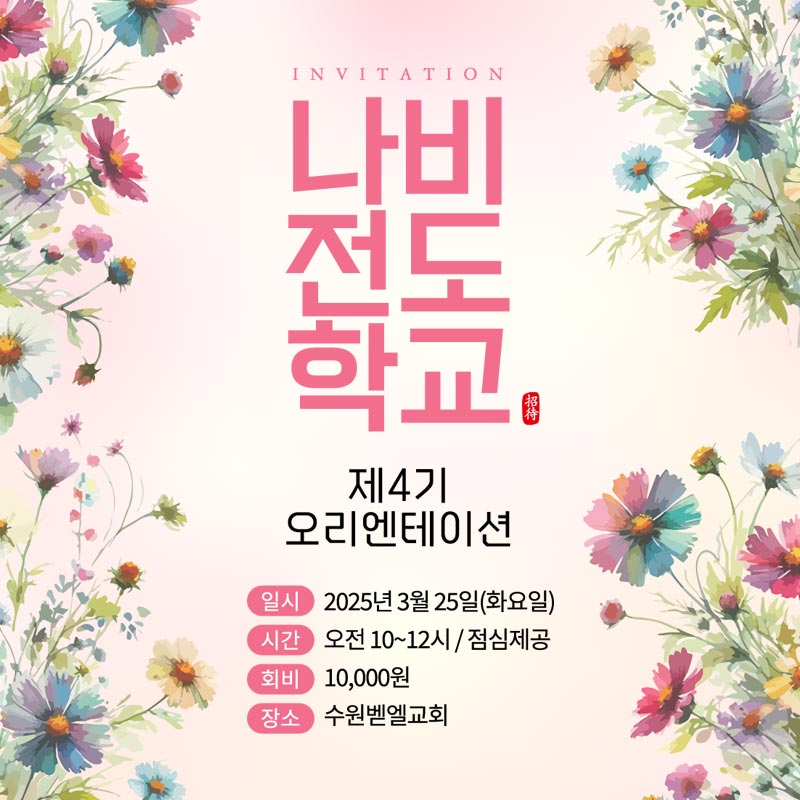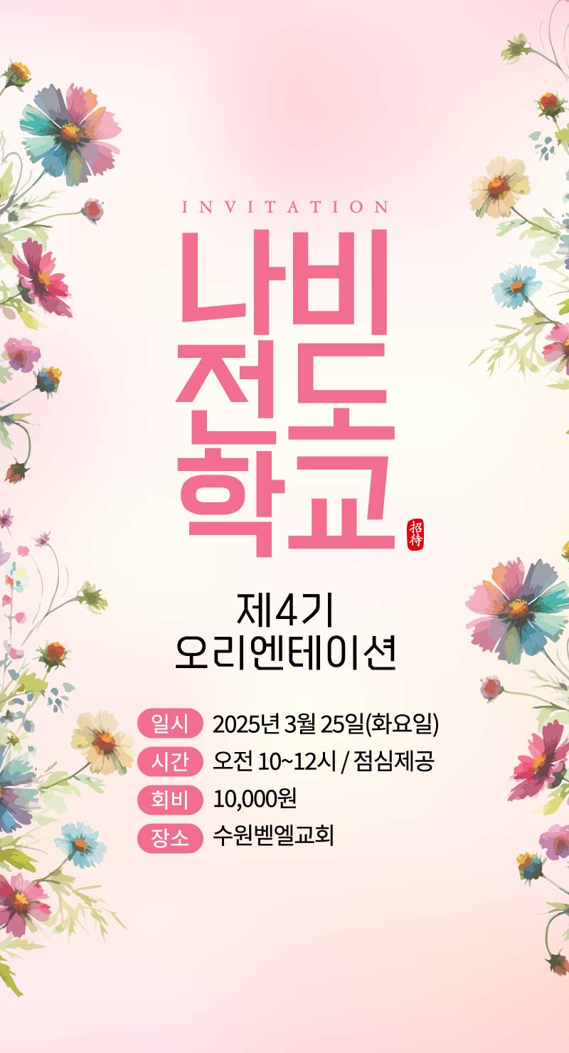 초대장 전반에 핑크·코랄·라벤더 톤의 수채화 꽃 일러스트를 풍성하게 배치해 봄날의 생동감과 따뜻한 환영의 분위기를 연출했습니다. '나비 전도학교'라는 행사명은 한글 캘리그래피 서체로 크게 강조해 화면에서 한눈에 읽히도록 구성했습니다. 전체적으로 밝고 부드러운 핑크 베이스 톤을 유지하면서도 정보 가독성을 높이기 위해 섹션마다 배경 컬러에 변화를 주었습니다.