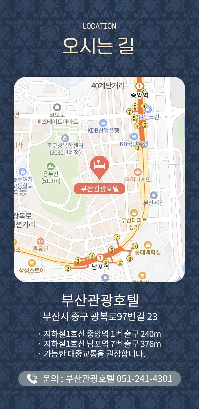 - 오시는 길(Location) : 지도 이미지와 교통 안내를 함께 담아 편의성 극대화