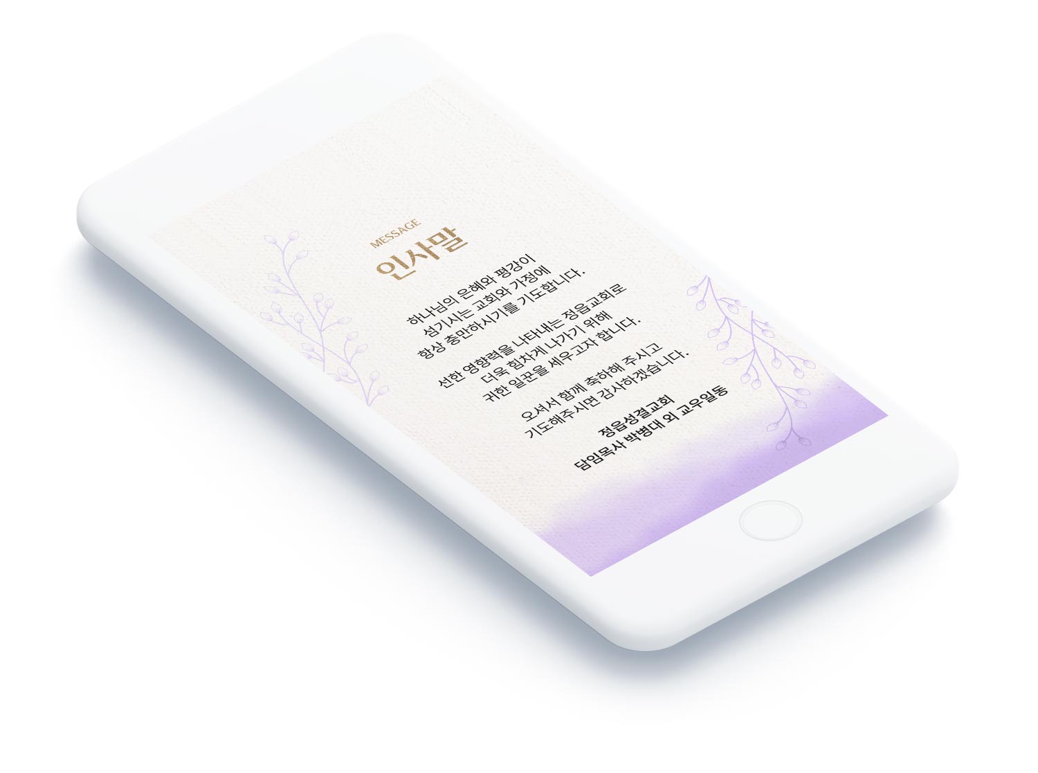 임직식은 교인뿐 아니라 직분자의 가족, 지인, 타 교회 목사님까지 폭넓게 초청하는 행사입니다. 이때 카카오톡으로 전달되는 모바일 초대장은 인쇄 초청장보다 빠르고 편리하게 배포할 수 있으며, 일시·장소·임직자 명단·오시는 길까지 한 화면에 담아 참석자에게 필요한 정보를 정확하게 전달할 수 있습니다. 무엇보다 예배의 격식에 걸맞은 품격 있는 디자인으로 첫인상부터 예배의 거룩함을 느낄 수 있도록 합니다.