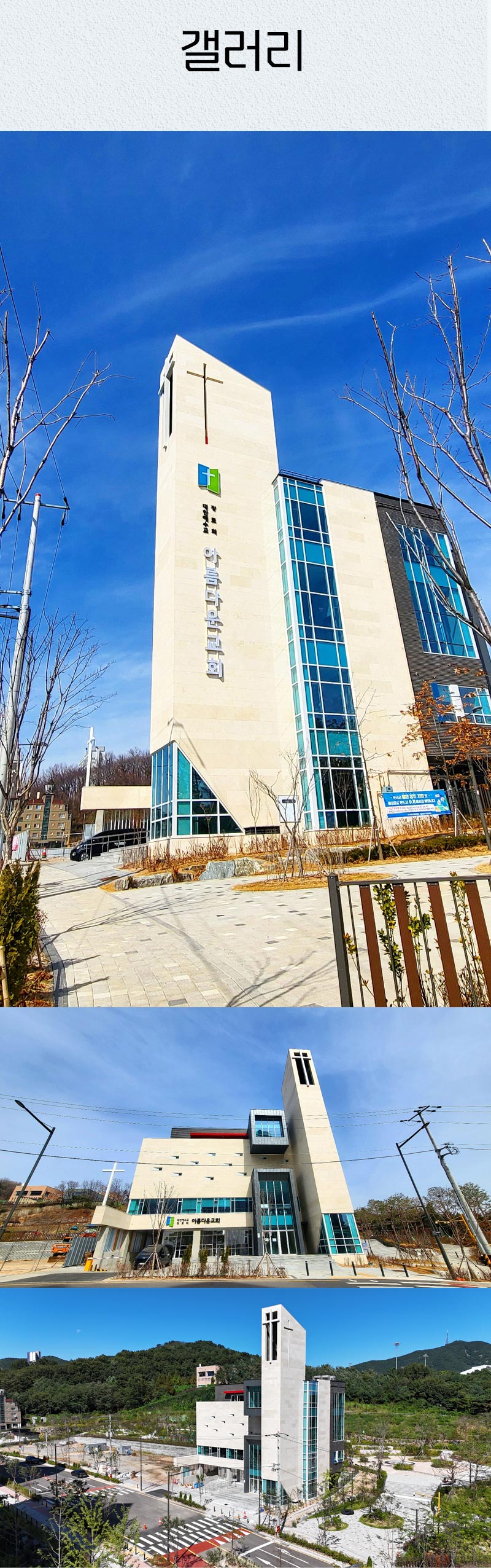 교회 로고와 실제 성전 외관 사진을 메인으로 배치하고, 블루·화이트 계열의 밝고 경건한 톤으로 입당의 기쁨과 감사함을 담아냈습니다. 모시는 글, 1·2부 예배 순서 안내, 오시는 길 지도, 새 성전 갤러리 이미지까지 한 화면에 담아 참석자 편의를 높였습니다.